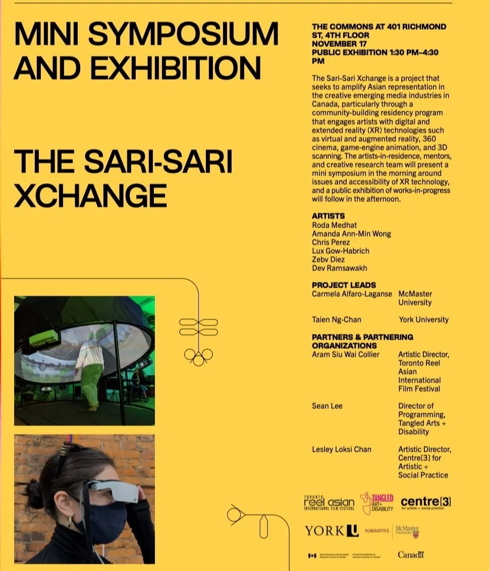 The Sari-Sari Xchange is a community-building research & creation project using Extended Reality (XR) (ie. Virtual, Augmented, Mixed Realities) to foster new works by artists from the Asian diaspora. We undertake exploration in emergent XR technologies and new storytelling techniques, address under-representation and issues of systemic racism as well as inaccessibility of these new technologies for both creators and users with accessibility needs.